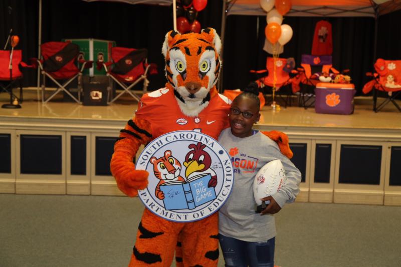The start of college football season marked the beginning of the annual Read Your Way to the Big Game Contest. All pre-kindergarten through eighth-grade students who read six books qualified to win four tickets and sideline passes to the Clemson vs. South Carolina game at Williams Brice Stadium on November 25th. Two students winners, one reading for Clemson and one for South Carolina, were selected at random from over 50,000 entries. University mascots, Cocky and Tiger, joined education officials at school assemblies to surprise the two lucky student winners with news of their selection.
