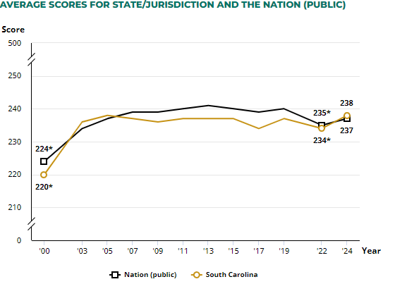 - 4th Grade Math: South Carolina students scored an average of 238, one point higher than pre-pandemic levels and four points higher than 2022, marking a statistically significant increase.